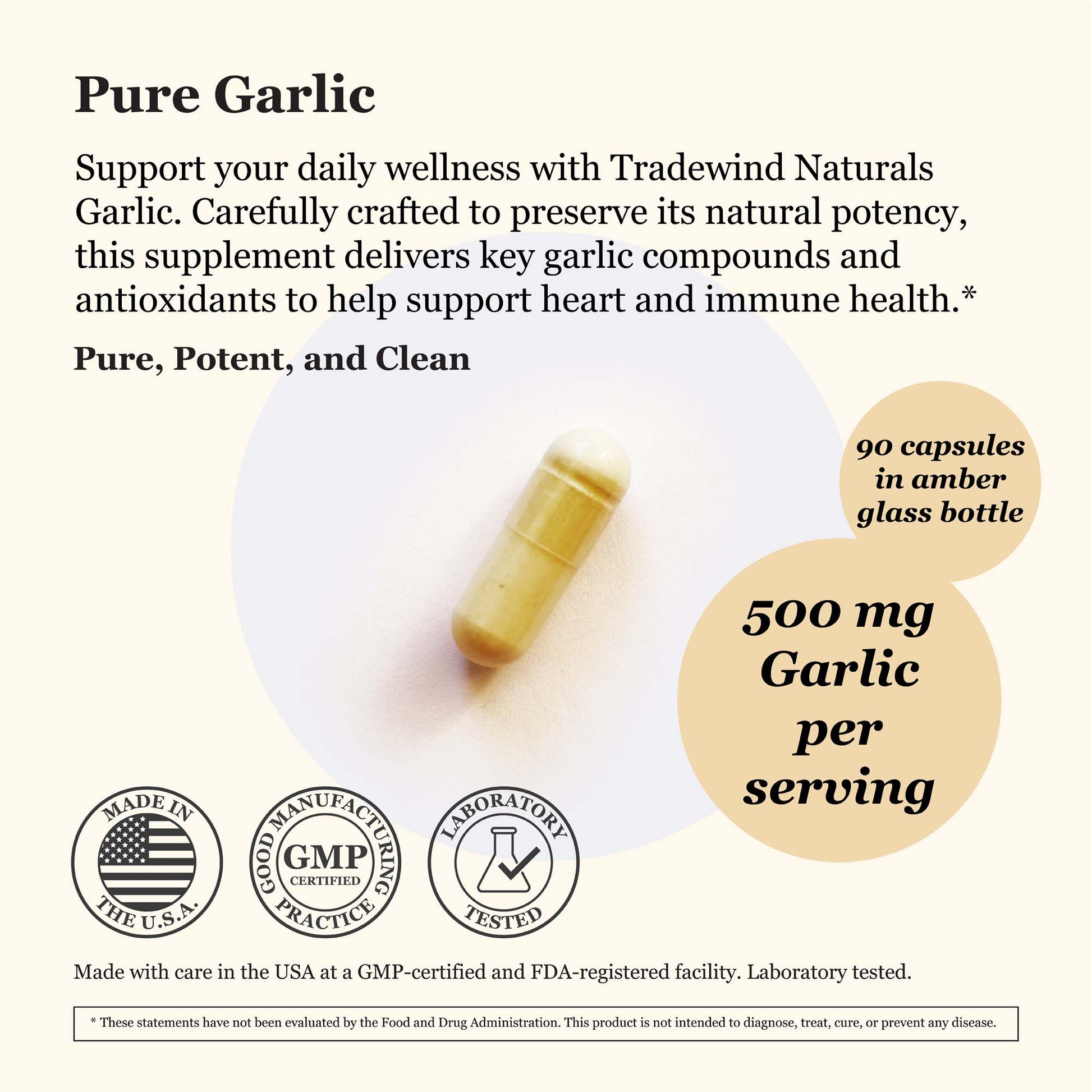 Support your daily wellness with Tradewind Naturals Garlic. Carefully crafted to preserve its natural potency, this supplement delivers key garlic compounds and antioxidants to help support heart and immune health.* Pure, Potent, and Clean.