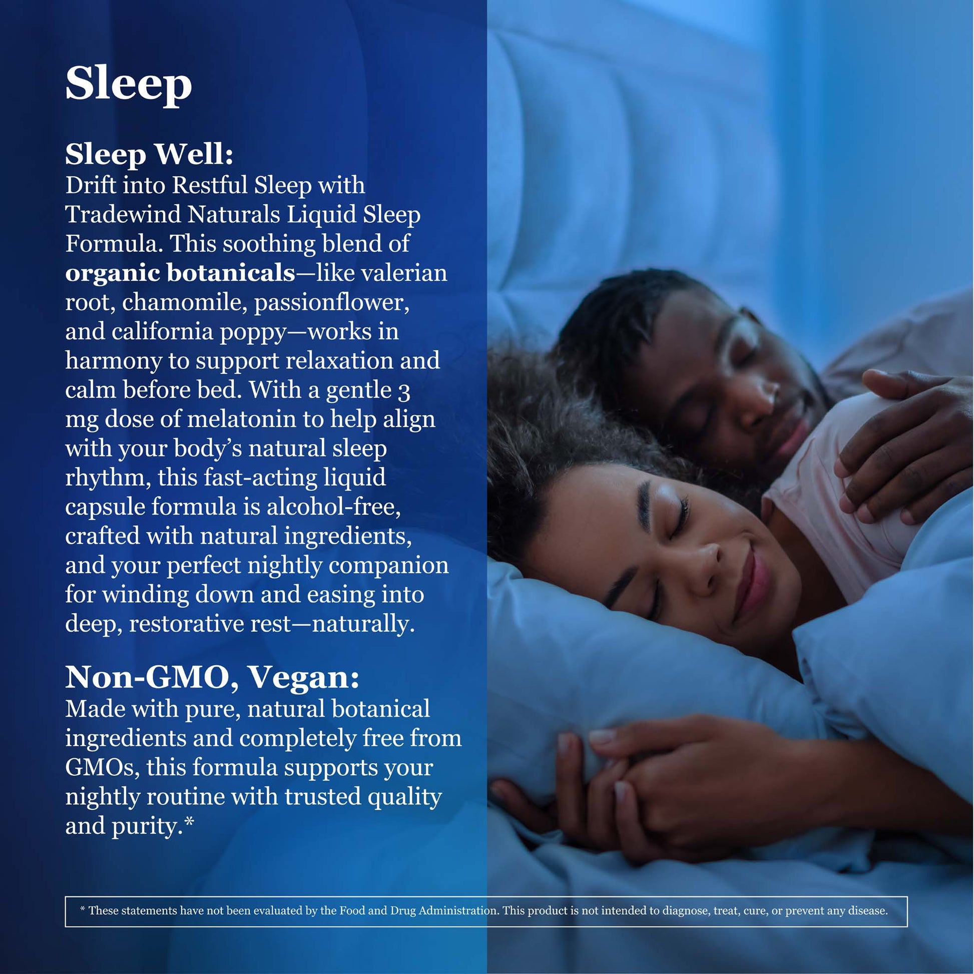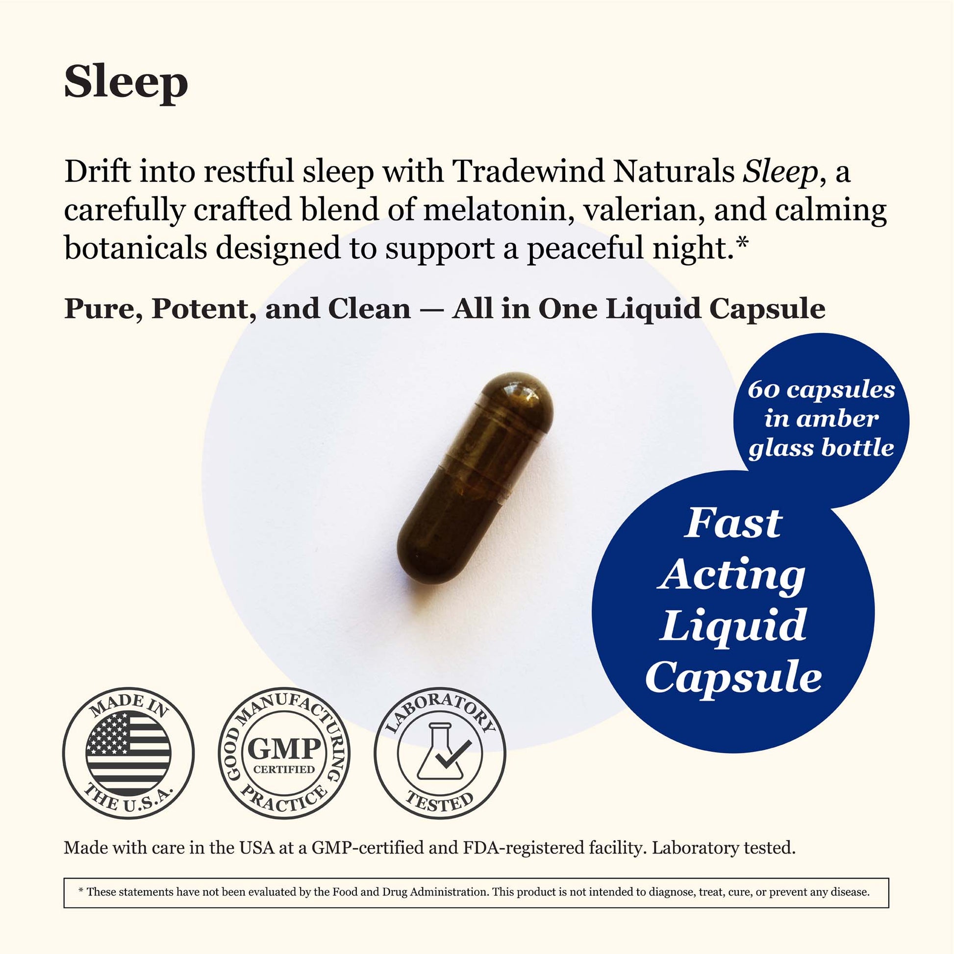 Drift into restful sleep with Tradewind Naturals Sleep, a carefully crafted blend of melatonin, valerian, and calming botanicals designed to support a peaceful night.* Pure, Potent, and Clean.